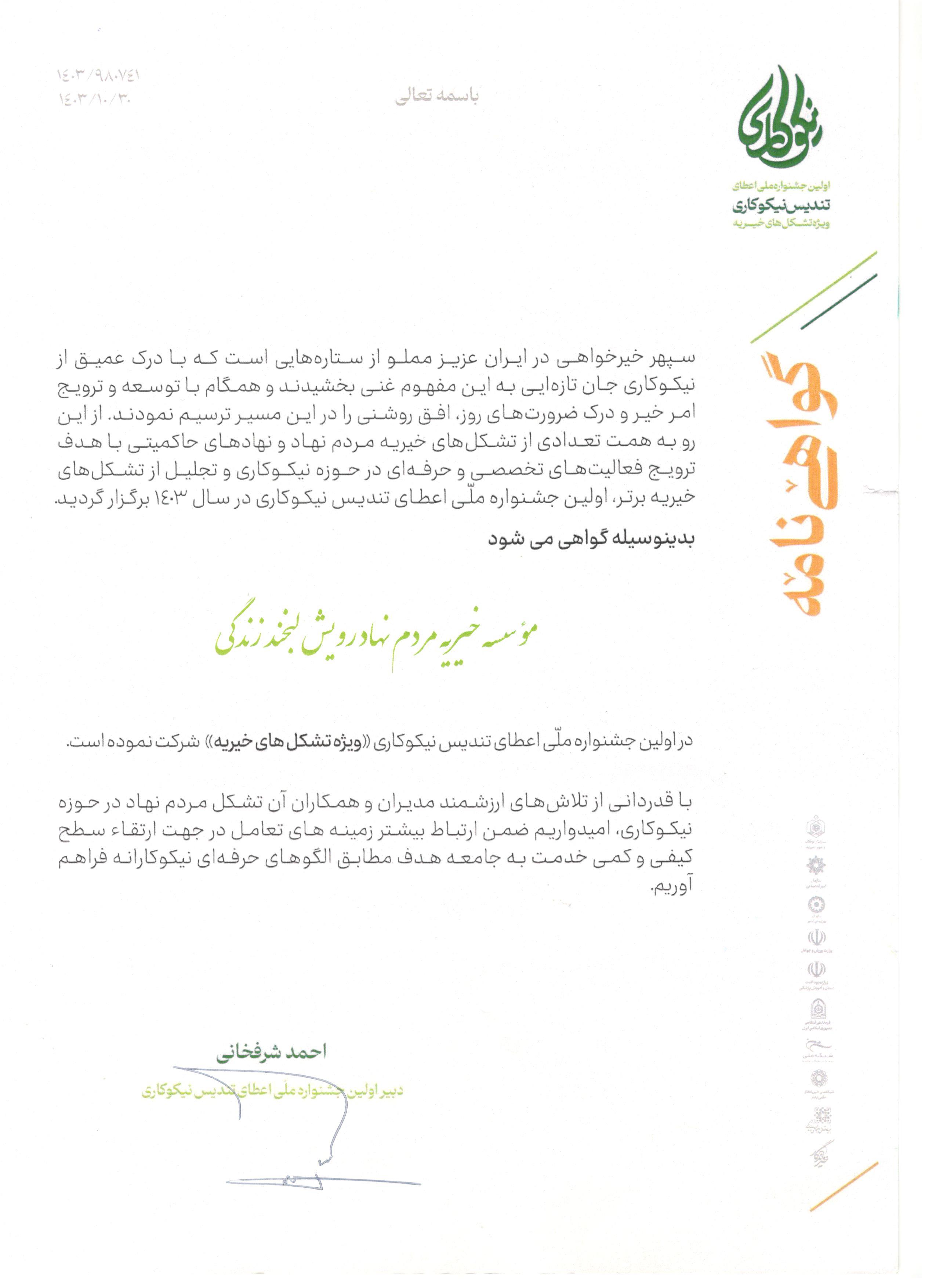 مؤسسه مردمنهاد «رویش لبخند زندگی» (واحد مسئولیت اجتماعی آرتان تجارت مانی خاورمیانه) با افتخار در اختتامیه نخستین جشنواره ملی اعطای نشان نیکوکاری حضور یافت و در جمع ۱۵۰ مؤسسه برتر کشور قرار گرفت. این جشنواره با هدف ترویج فعالیتهای حرفهای نیکوکارانه، معرفی الگوهای برتر و تجلیل از تشکلهای خیریه برتر برگزار شد. در مراسم اختتامیه که با حضور محمدرضا عارف، معاون اول رئیسجمهور، برگزار شد، مؤسسات منتخب در سطوح ملی، استانی و شهرستانی معرفی و تجلیل شدند. حضور «رویش لبخند زندگی» در این رویداد ملی، نشاندهنده تعهد و تلاشهای مستمر این مؤسسه در حوزه نیکوکاری و مسئولیت اجتماعی است.